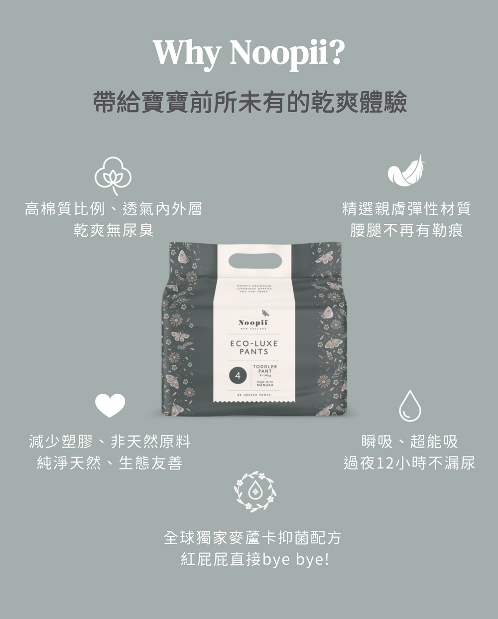 全球獨家添加麥蘆卡(Manuka)純露,搭配超吸水透氣材質,幫助寶寶遠離紅屁屁!