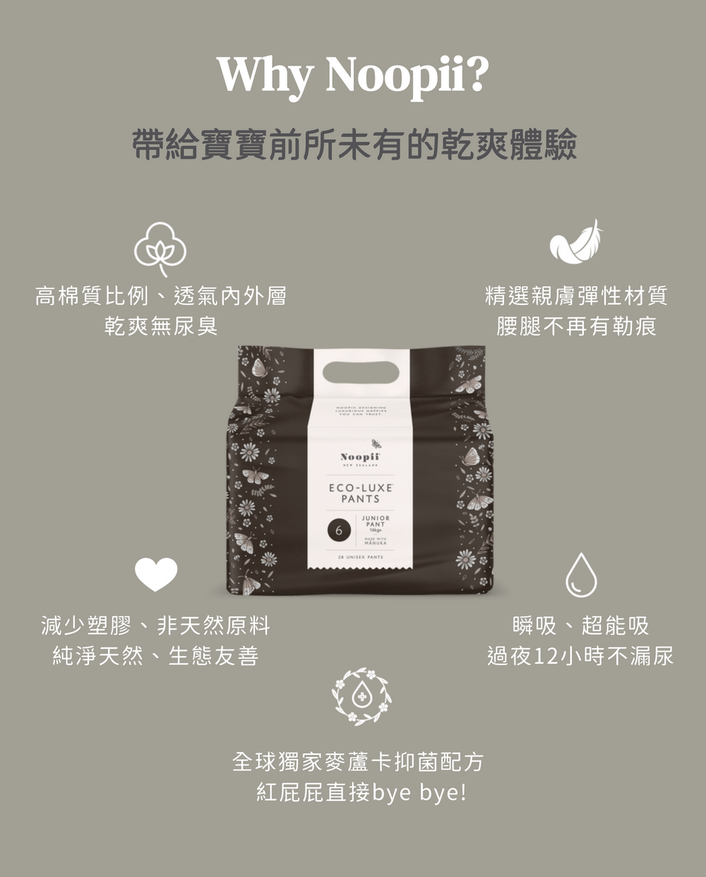 全球獨家添加麥蘆卡(Manuka)純露,搭配超吸水透氣材質,幫助寶寶遠離紅屁屁!